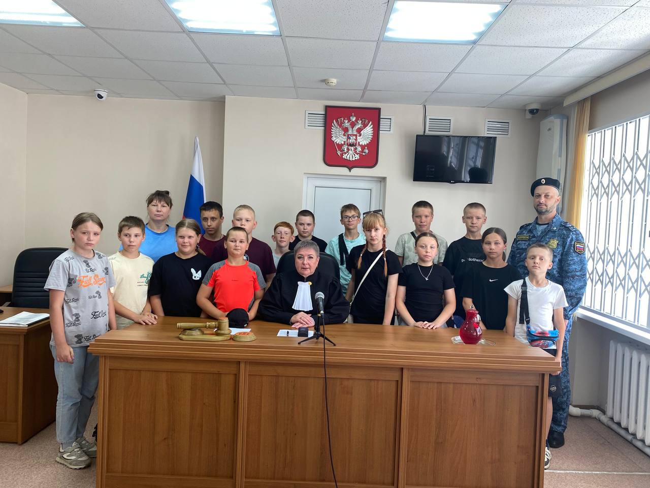 Армизонский районный суд провел серию экскурсий для детей, посещающих лагери с дневным пребыванием, организованных на базах образовательных, досуговых и спортивных учреждений. 2 июля 2025 года суд посетили воспитанники лагеря с дневным пребыванием МАУ ФК и С «Физкультурно-оздоровительный центр» (подробнее), а 3 июля 2025 года гостями служителей Фемиды стали ребята из МАОУ ДО «Дом творчества». Судебные приставы, со всей строгостью, провели досмотр посетителей, рассказали о правилах поведения в суде, предупредили о необходимости выключения звука на мобильных телефонах и проводили в зал судебных заседаний. «Прошу встать, Суд идет!» - объявил секретарь судебного заседания Михаил Черепанов и в зал вошла судья Елена Викторовна Максимова. Поприветствовав юных граждан Российской Федерации, судья рассказала о функциях суда, о том, как проходят судебные процессы, о работе аппарата суда и судебных приставов. Затем Елена Викторовна ответила на вопросы самых любознательных посетителей. Главной темой вопросов стала ответственность несовершеннолетних на правонарушения и преступления. После общего фото на память ребята с интересом побывали в конвойном помещении, примеряли бронежилет, рассматривали технические средства охраны. Проведенные встречи оставили положительные впечатления как у ребят, так и у принимающей стороны.